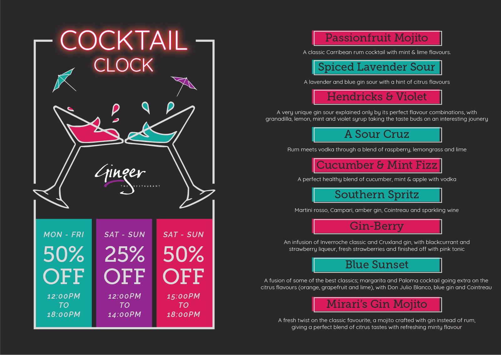 Share This OfferRelax and enjoy a refreshing treat with our exclusive cocktail specials! Take advantage of our unbeatable 50% discount on selected cocktails every Monday to Friday from 12:00 to 18:00. Weekends bring even more joy with a delightful 25% off from 12:00 to 14:00, and the excitement peaks with a spectacular 50% off from 15:00 to 18:00. Let the hours tick away happily as you sip, savour, and indulge during our special Cocktail Clock hours.